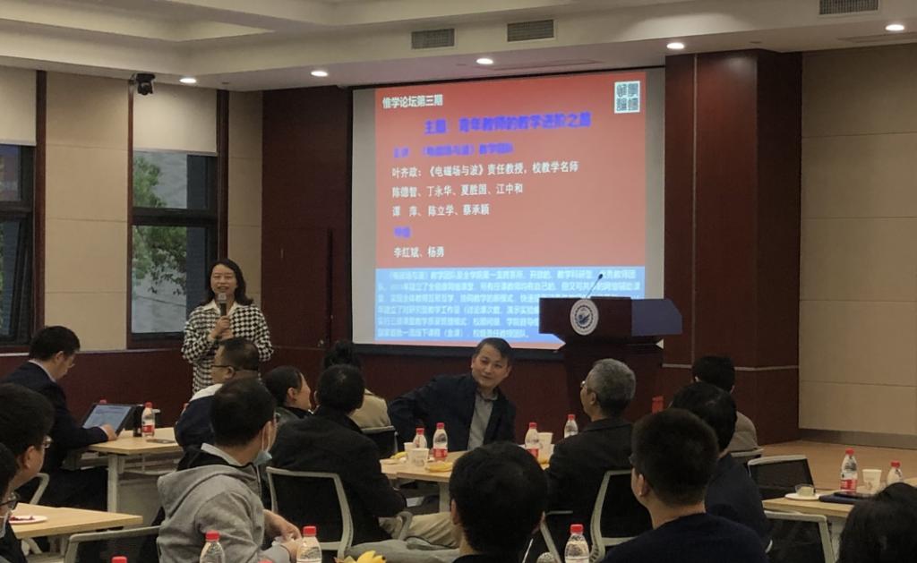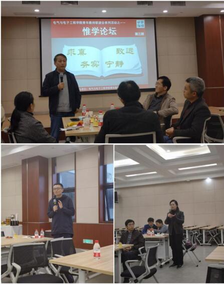 为了增进教师间的沟通交流,帮助青年教师进一步的教学成长,2021年3月31日下午两点钟,由华中科技大学电气与电子工程学院青年教师联谊会主办的惟学论坛系列讲座第三期于电气大楼B203顺利举行,主题为“青年教师的教学进阶之路”。本次活动邀请了2020年国家首批一流线下课程(金课)团队—《电磁场与波》教学天团作客,学院主管教学工作的李红斌副院长与杨勇教授作为特邀嘉宾,为广大青年教授们亲身传授教学经验,解读教学工作的相关政策,深入研讨如何做好教学工作以及为青年教师解答在教学进阶之路上遇到的困惑。