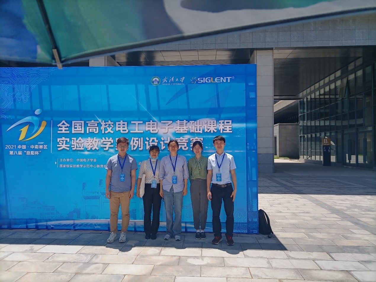 2021年5月8日,实验中心徐慧平、吴葛、易磊、冯学玲、徐琛、石丹老师共6支队伍赴武汉大学参加第八届全国高校电工电子基础课程实验教学案例设计大赛中南赛区初赛,5支队伍获奖。其中吴葛老师和徐琛老师团队获得一等奖,冯学玲老师和易磊老师团队获得二等奖,石丹老师团队获得三等奖。最终吴葛老师和徐琛老师团队的作品被推荐参加全国复赛,经过激烈角逐,斩获全国三等奖。