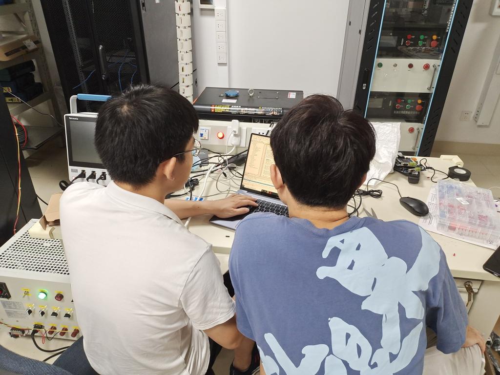 伟德(bevictor)官方网站电力系研究生杨丘帆、董天翔正在调试实验平台