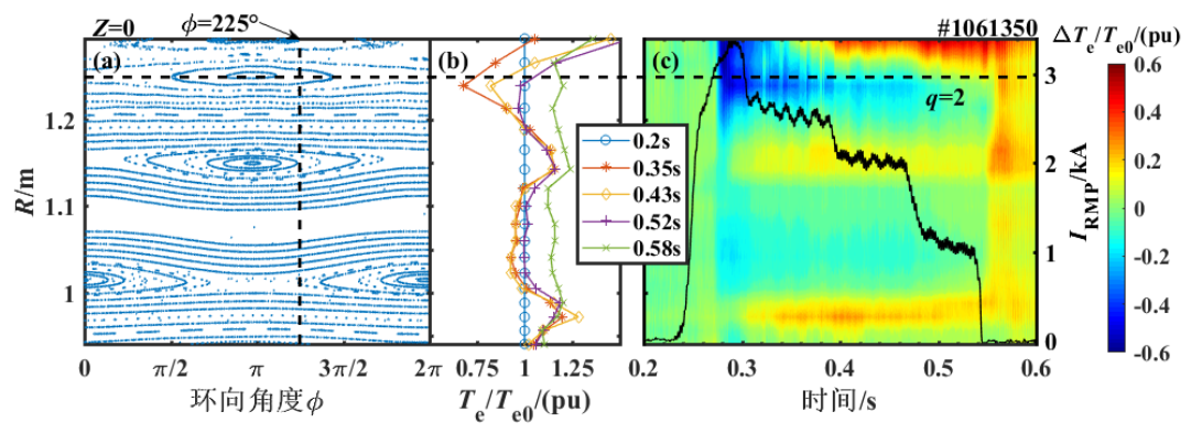 图2(a)Z=0处庞加莱图; (b)不同时刻,电子温度相对变化量随大半径变化; (c)电子温度相对变化量随时间演化的等高线图;黑线为投入RMP线圈电流