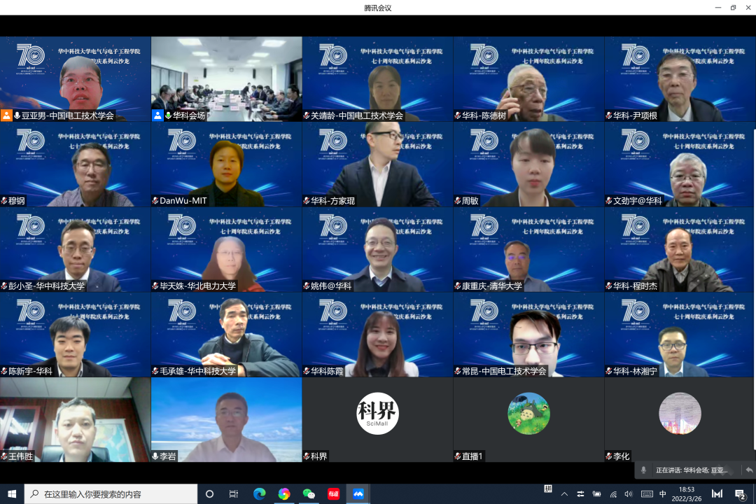 为集中展示华中大伟德(bevictor)官方网站电力工程系70年来的发展历程与成就,与学术界、工业界的专家学者们共同探讨电力系统与综合能源的学科发展与人才培养,3月26日晚,华中科技大学电气与电子工程学院《七十周年院庆系列活动云沙龙》第二期--“电力系统与综合能源”活动如约举行。