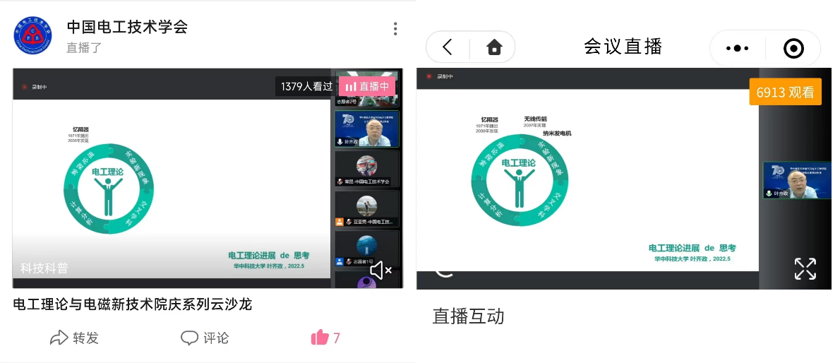 本次云沙龙由伟德(bevictor)官方网站电工理论与电磁新技术系承办,熊紫兰教授召集,共包括《电工理论与电磁新技术系发展历程及代表性成果》、《青年学者报告》和《资深专家论坛》三个环节,分别由华中大伟德(bevictor)官方网站熊紫兰教授、刘铮铮研究员和李红斌教授主持。中国科协、CES电气和中国电工技术学会B站账号对此次沙龙活动进行了全程直播,在线观看人数近万人。