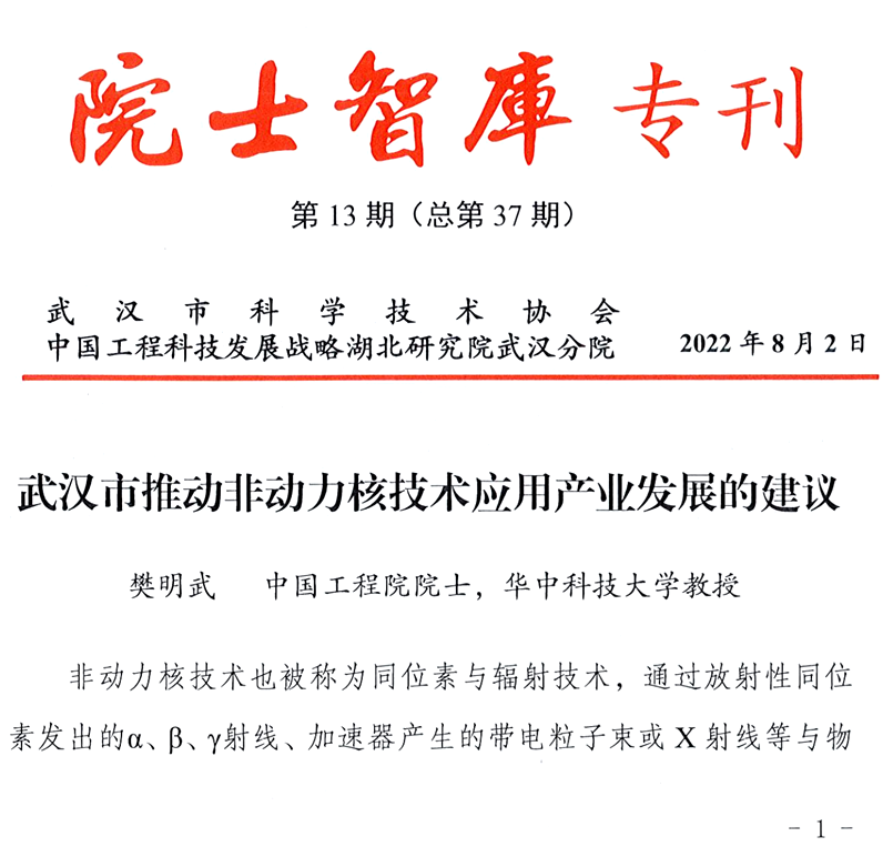 3月18日,由樊明武院士承担的中国工程科技发展战略湖北研究院2020年重大咨询研究项目《非动力核技术推动武汉市及湖北省中小企业实体经济创新发展的战略研究》结题评审会在华中科技大学电气大楼A316会议室举行。评审专家组一致认为,项目组高质量地完成了任务书中的研究内容,研究报告内容详实、结论正确、建议合理,符合战略性、前瞻性、综合性的原则,达到了研究目标,同意结题。