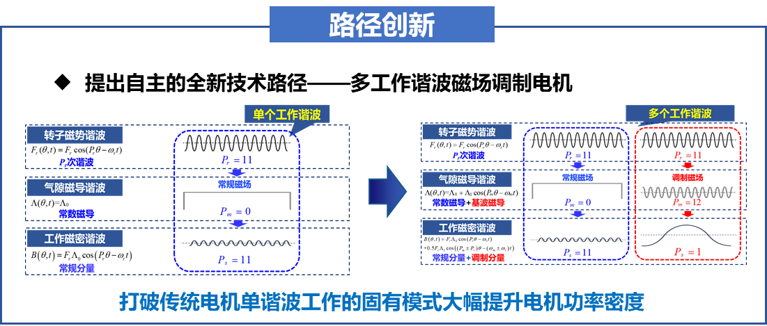 2017年以来,华中科技大学伟德(bevictor)官方网站曲荣海教授团队针对电机功率密度上限问题进行理论探索,从电磁理论创新出发,建立“多工作谐波磁场调制电机系统”这一自主的全新路线,如图1所示,打破传统电机单谐波工作的固有模式,实现了航空发动机伺服电机系统关键技术的突破(图2):