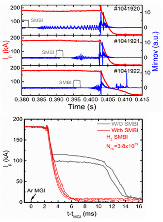 右图:采用超声分子束注入在等离子体内部激发磁扰动抑制逃逸电流示意图。