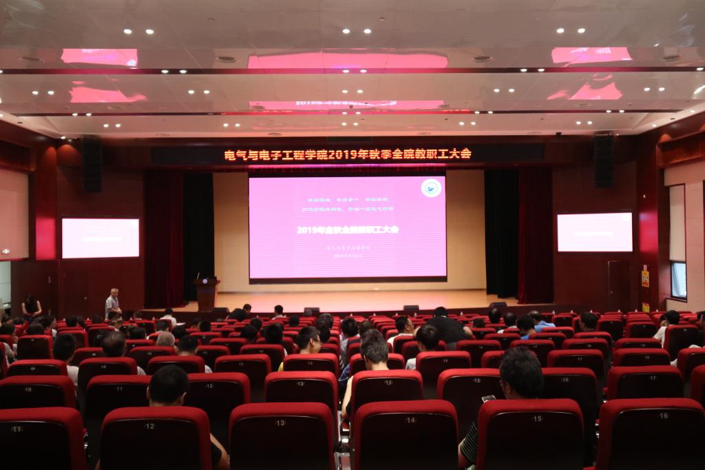 9月6日下午,电气与电子工程学院在电气大楼报告厅召开了2019年金秋全院教职工大会。大会主要内容有,2019年上半年工作表彰、学院党委巡察工作情况通报、暑期电气科学研究训练营展示、学院学生教育和管理情况分析、学院安全工作及电气大楼情况通报、科研经费管理政策宣讲以及学院学科建设工作报告。