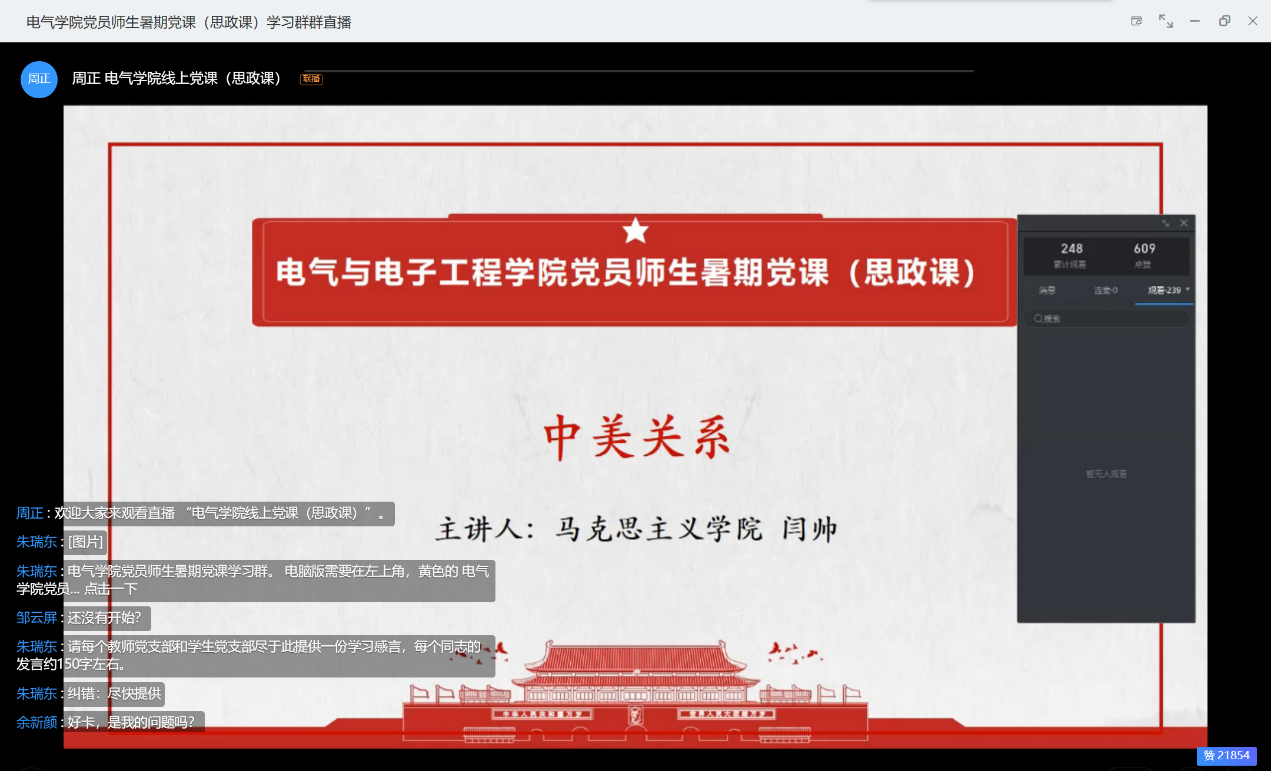 7月22日下午,伟德(bevictor)官方网站在钉钉平台上开展第二期暑期党课学习。学院邀请到了华中科技大学国家治理研究院研究员、马克思主义学院副教授闫帅,以“新冠疫情冲击下的中美关系”为主题,为伟德(bevictor)官方网站党员师生们上了一场精彩的党课,总共近1000名师生参与了学习。