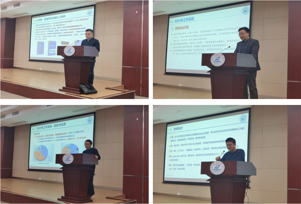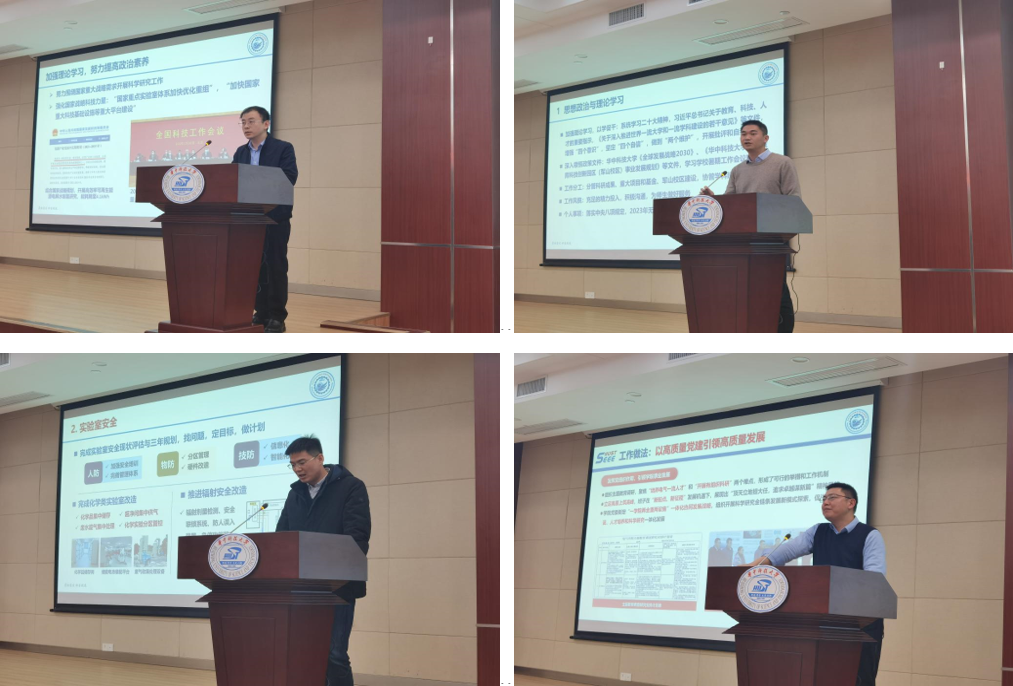 学院党政班子成员胡家兵、杨勇、秦斌、孔武斌、方家琨、刘毅、吕以亮等依次述职述廉,报告了自己的思想政治学习和履行党风廉政建设、意识形态建设、师德师风建设工作职责情况,汇报了所分管业务工作取得的成绩、采取的新举措、存在的问题和下一步工作计划。