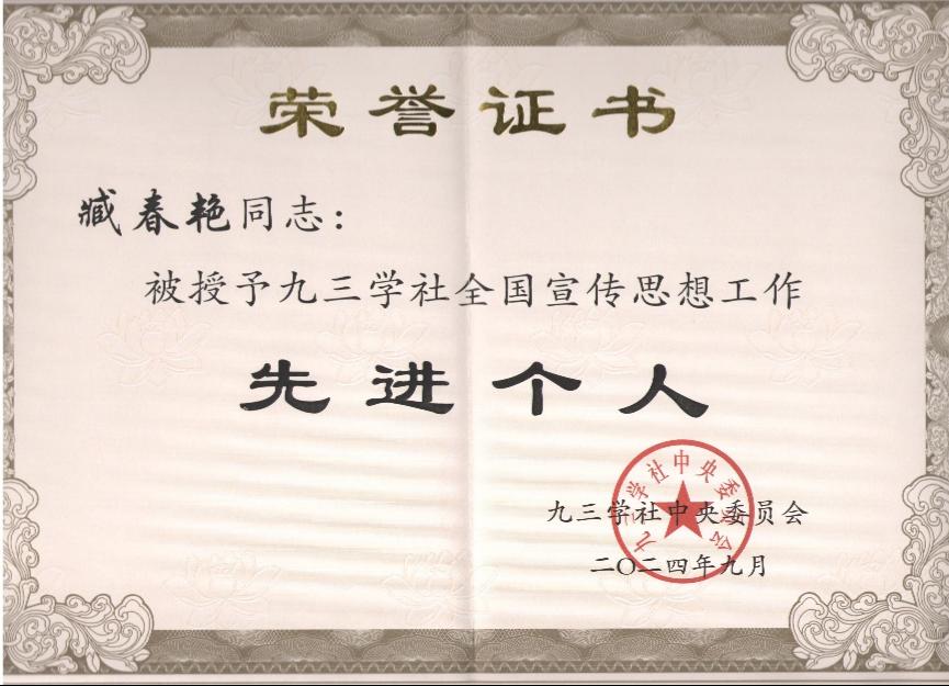 臧春艳自2012年加入九三学社以来,连任三届九三学社华中科技大学委员会委员,在我校九三学社的组织与宣传方面做了大量的工作。2014年臧春艳荣获了九三学社中央“庆祝九三学社创建70周年优秀征文一等奖”,2019-2021年期间,她又以饱满的热情完成了《华中科技大学统一战线工作纪实》中的“九三学社”章节的史料汇总编纂工作,总计三万四千余字。她在民主党派唯一的中央级党报《团结报》上发表了数篇文章,还在九三学社湖北省委网站、华中大新闻网等网络媒体上发表我校九三学社多位先进人物事迹及重大活动的报道。