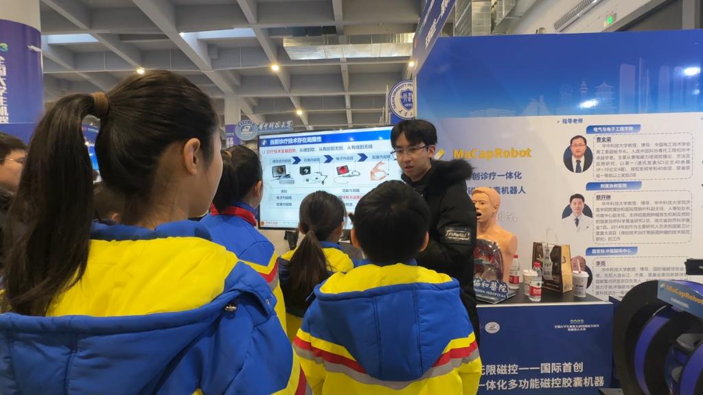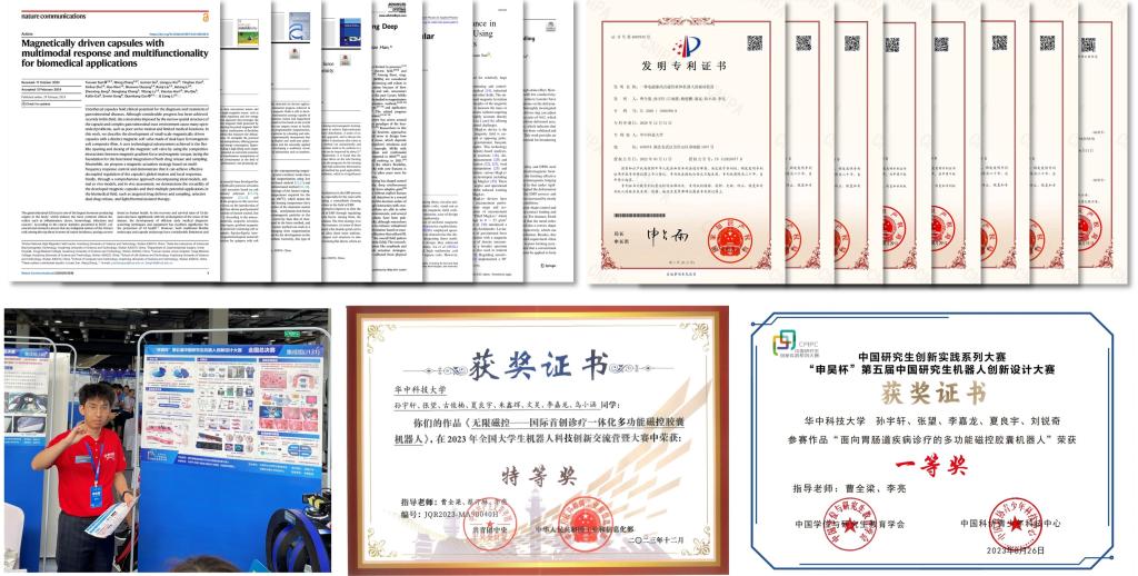 医工攻坚,守护生命健康。面对我国高端医疗装备长期受制于人的困境,孙宇轩组建跨学科攻关团队“无限磁控”,深入武汉协和医院等临床一线调研,将磁控软体机器人技术与临床需求深度融合。针对现有胶囊机器人“只能诊、不能疗”的难题,孙宇轩及其所在团队首次将磁控软体机器人技术引入胶囊设计中,打破了传统内置刚性永磁体设计模式,形成国际首创的磁控软体胶囊机器人技术路线,为实现胶囊机器人诊疗一体化提供了全新方案。所开发机器人较国际水平体积减小25%,有效载荷提升5倍。凭借这一创新成果,孙宇轩带领团队先后斩获2024年中国国际大学生创新大赛金奖、2023年全国大学生机器人科技创新交流营特等奖、第五届中国研究生机器人创新设计大赛全国一等奖等双创赛事最高荣誉。