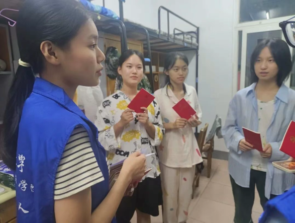 激发入党意愿。学院组织高年级党员走进“一站式”学生社区,开展“党员进寝室”活动,为每位新生送上《中国共产党章程》。这也是许多新生进入大学后收到的第一本书籍。高年级党员与新生亲切交流,分享自己的入党经历和学习体会,解答他们对于大学生活、专业学习、人际交往等方面的困惑。他们详细介绍了大学生入党流程和要求,鼓励新生积极向党组织靠拢,并提交入党申请书,主动接受党组织的培养和考察。