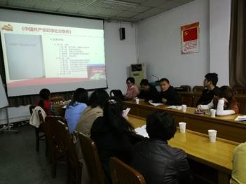 10月26日下午,学院行政党支部开展主题党日活动,全体党员和职员集中学习了《中国共产党纪律处分条例》、鄂纪发〔2018〕8号文件和三个通报(湖北省纪委〔2018〕第8期通报、湖北省纪委〔2018〕第29期通报、湖北省纪委〔2018〕第30期通报)。支部成员集中观看了《中国共产党纪律处分条例》和《中华人民共和国监察法》在线访谈视频。观看视频后,党员们纷纷表示:认真学习《条例》和《监察法》是摆在每一个共产党员面前的必修课,作为一名教育行业的基层普通党员和职员,应该做好理论联系实践,不断提高自身的政治理论素质和法律意识;要把学习贯彻《条例》与党支部开展“对标创先”活动紧密结合起来,对热情对师生服务,像春天般的温暖,提高服务水平和质量;党员要通过自身的认真学习和提高,切实发挥一名共产党员的先锋模范作用,从而带动身边人忠于职守,履职尽责,为建设世界一流学科做出自己应有的贡献。