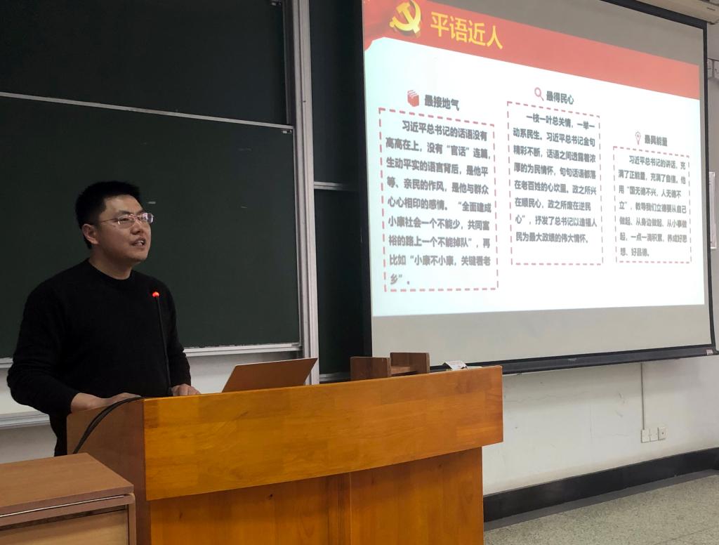 张明从“做理想信念践行者”“做服务人民的力行者”“做求真务实的笃行者”“做德才兼备的前行者”等四个方面分享自己的体悟,号召大家做平语的行者,时时刻刻在行动上坚持做六有大学生。他表示理想信念是本,理想信念是魂,正是因为理想信念,心中有信念,脚下才有力量,二万五千里的长征才会胜利。他结合黄旭华老先生的事迹告诉大家,正是因为有理想信念,黄旭华才能有坚不可摧的精神力量,才能在风浪考验面前无所畏惧;青年习近平在梁家河七年艰苦生活的磨砺,让他树立了矢志不渝的理想信念和“要为人民做实事”的人生目标。