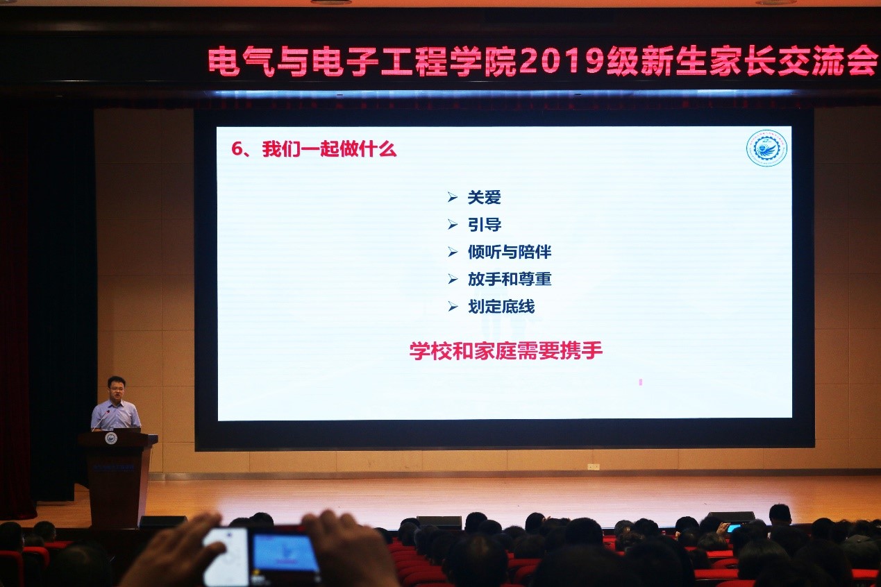 8月30日晚,在圆满完成现场迎新工作后,学院在电气大楼报告厅举行了新生家长会。学院领导分别从学院发展现状、人才培养体系、学生教育管理体系和国际化情况等方面对学院进行了细致的讲解。报告厅内座无虚席,家长们表示对学院的学生培养工作非常支持,愿意同学院一起,陪伴孩子成长成才。