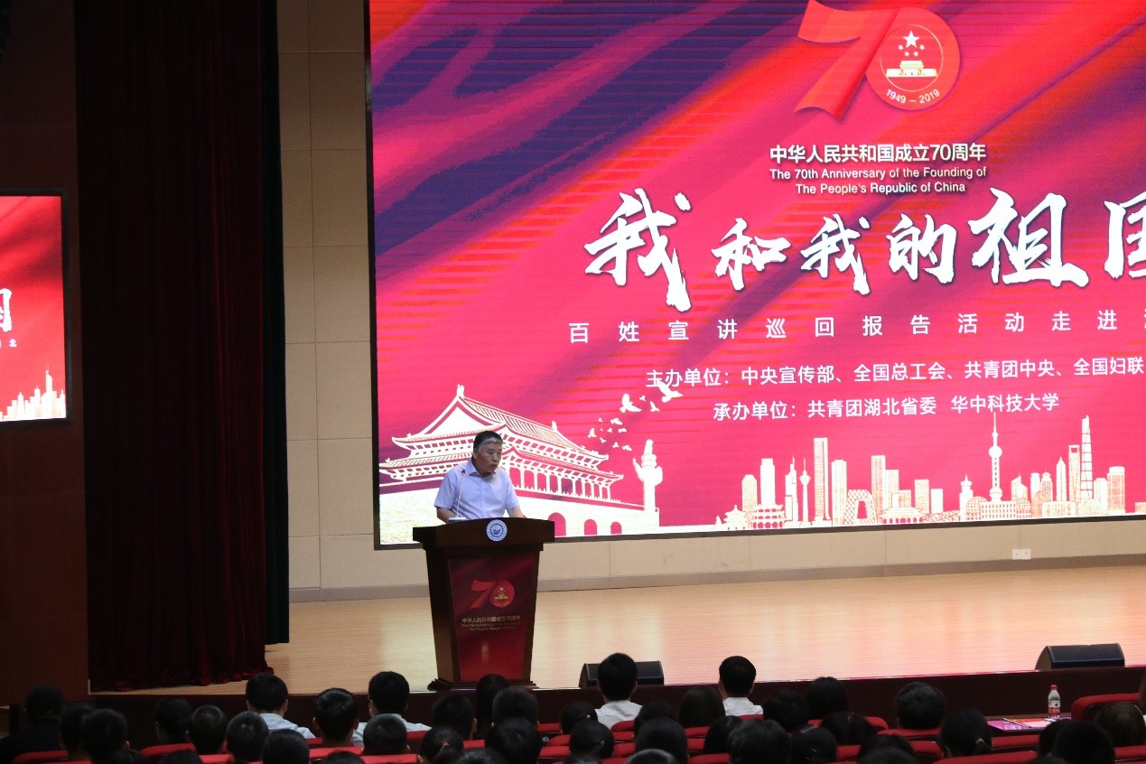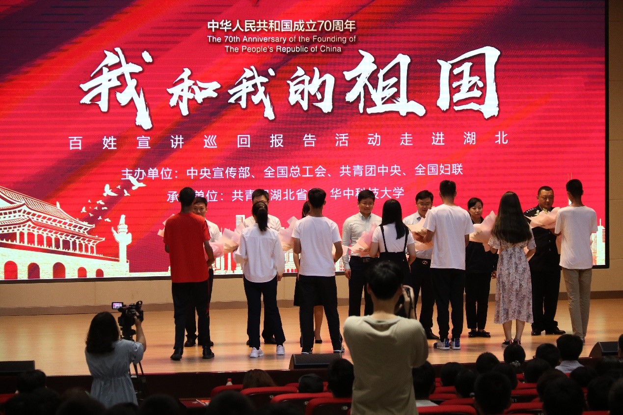 为隆重庆祝中华人民共和国成立70周年,大力唱响礼赞新中国、奋进新时代的昂扬旋律,9月10日上午,由中央宣传部、全国总工会、共青团中央、全国妇联联合开展的“我和我的祖国”百姓宣讲活动走进湖北,来到了华中科技大学。宣讲团先进典型在电气大楼报告厅为师生作了精彩的报告,学院2019级新生有幸在现场聆听。