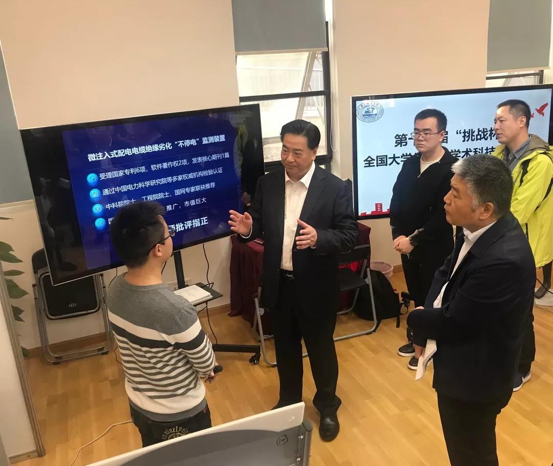 11月7日至13日,第十六届“挑战杯”全国大学生课外学术科技作品竞赛终审决赛在北京航空航天大学隆重举行,我校共有5支队伍参加,并全部斩获全国一等奖,获一等奖数量为历史最多。我院由周磊、郝嘉睿、杜步阳、黄煜彬、姚雅涵、李弘毅、殷浩然组成的“慧眼识电”本科生团队,在陈庆老师和李红斌老师的指导下,历经两年时间完成的作品“微注入式配电电缆绝缘劣化‘不停电’监测装置”, 最终获得全国一等奖,取得了学院在“挑战杯”竞赛中的历史最好成绩。