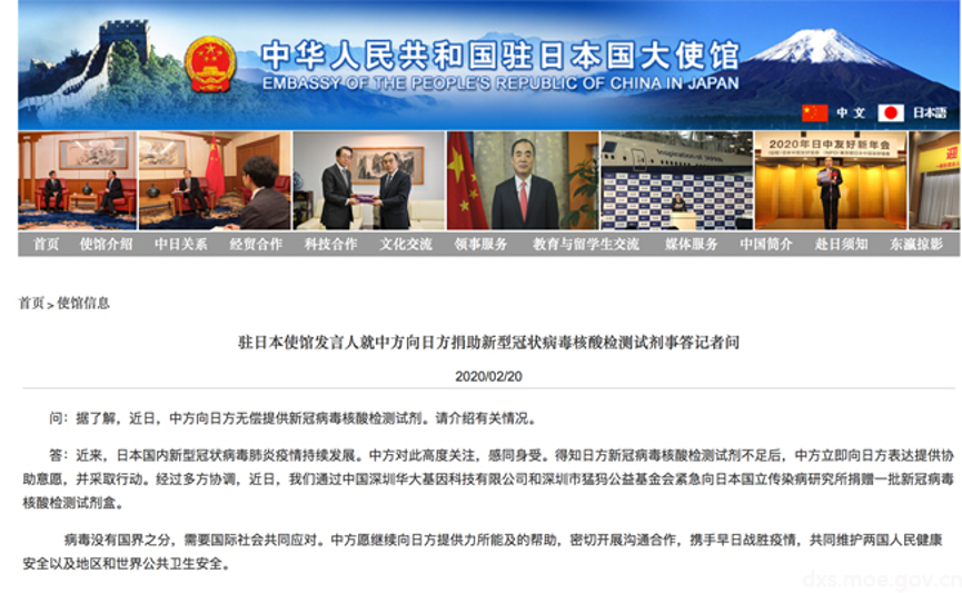 (中国驻日本大使馆网站截图)