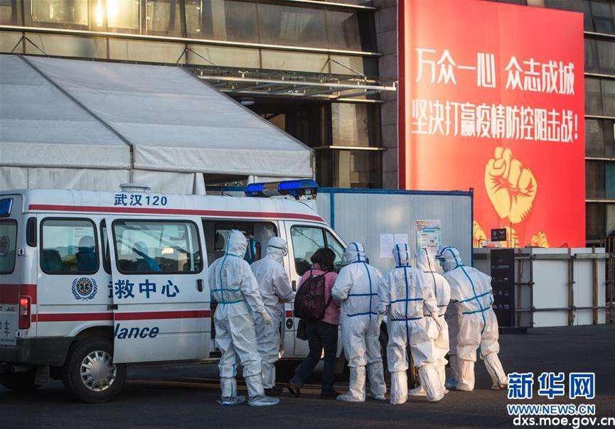 (医护人员将患者送入武汉体育中心方舱医院(2月12日)。 新华社记者 肖艺九 摄)