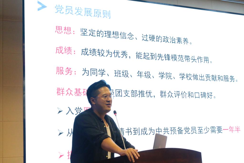 严老师开始正式为大家讲解作为党员应有的品格和素质。严老师提出,“育才造士,为国之本”,当代青年大学生除却学习,更要学会担责,所以同学们应当关心国家大事,担当国家使命;习近平总书记五四青年节前期重要讲话中对青年学生寄予厚望,青年学生应“牢记一段寄语,坚定一种信念,共筑一个梦想”,严老师鼓励建立“勇于担当,励志勤学,刻苦磨练,激情奋斗”的青年精神、树立与这个时代主题同心同向的理想信念 ,并强调了当今中国最鲜明的时代主题,就是实现“两个一百年”奋斗目标、实现中华民族伟大复兴的中国梦。台下同学听得十分认真,并不时地记笔记。