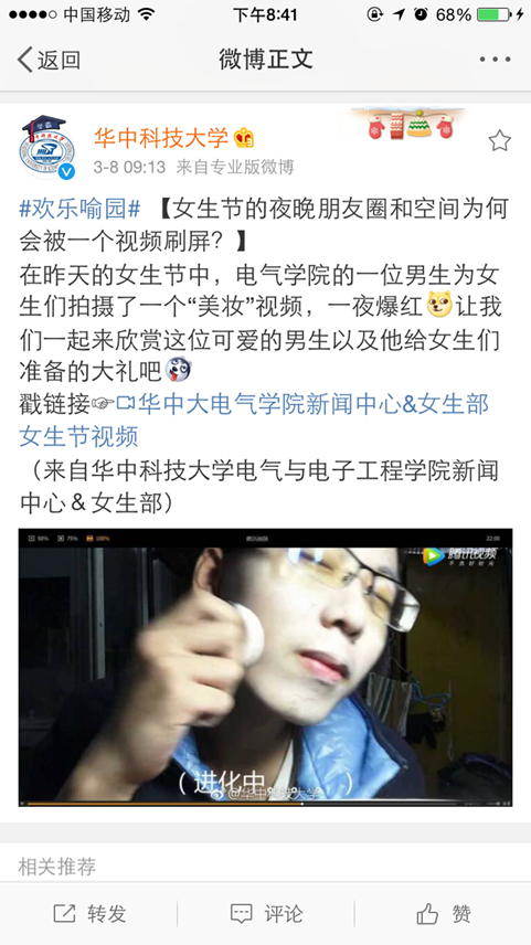 3月7日的晚上,由我院女生部和院新闻中心联合给众女神送上的化妆教程视频发布,并在院内外引起了巨大反响,播放量已经达到25万。华中科技大学官方微博也转载了视频,不仅让更多人认识了伟德(bevictor)官方网站,也让更多人了解,认识到了一个不一样的华科。相信这样的女生节,会让女生们切实感到温暖,让“电气同心力”的精神发扬下去。同时也为华科增添了一分人文的精神与关怀。