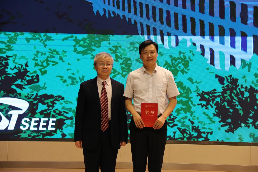 文劲宇院长为梅文庆颁发华中科技大学“校外辅导员”聘书。