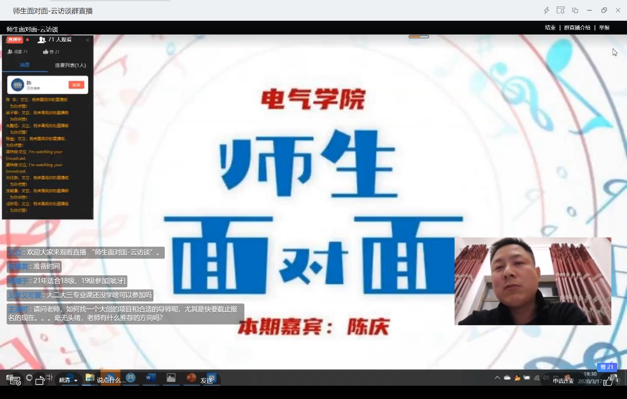 “陈庆老师已经加入了我们的直播间,让我们欢迎陈老师!”本次访谈的主持人、辅导员许文立老师说到。在伟德(bevictor)官方网站师生面对面云访谈直播间中,同学们迎来了第一位线上嘉宾。陈庆老师是学院“慧眼识电”学生团队的指导老师,2019年,他带领团队斩获了全国“挑战杯”一等奖,取得了学院在“挑战杯”竞赛中的历史最好成绩。