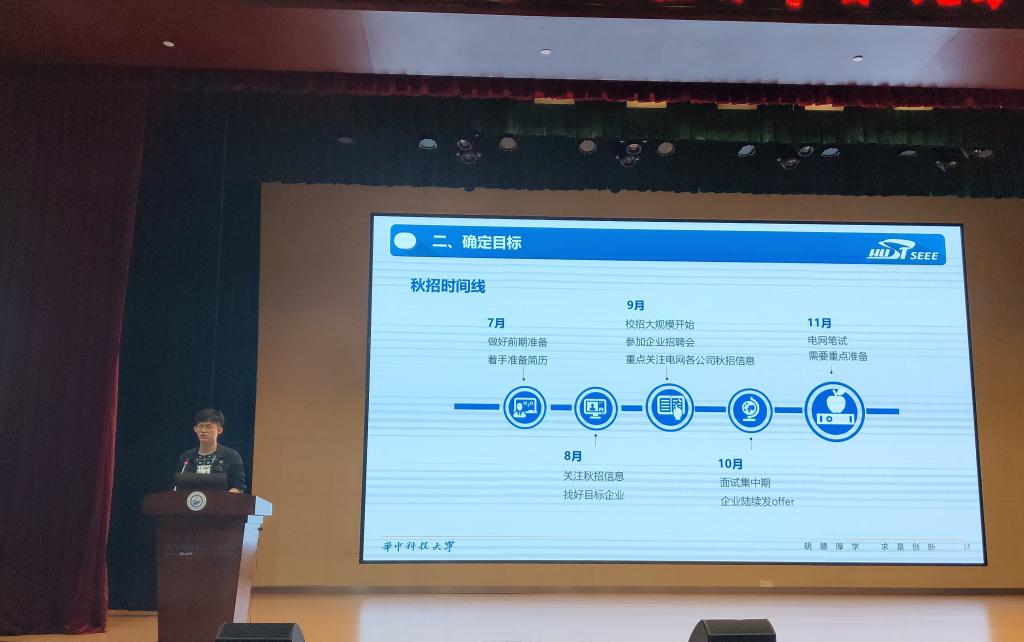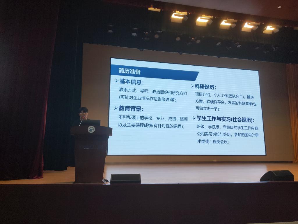 接下来签约了国网辽宁省电力公司大连供电公司的张成涛分享了他的秋招准备流程和在就业择业中的思考体会,并介绍了简历中需要重点强调的内容。他还讲了自己对工作与生活关系的看法,就确定就业目标提供了一些思路,同时提醒同学们不要过于焦虑,一定要学会调整好心态。