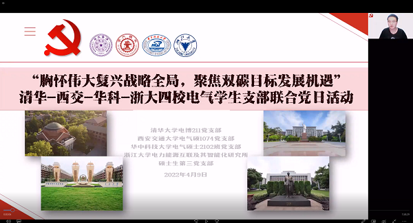 4月9日晚,清华、浙大、华科、西交电气学科四校学生党支部全体学生党员和部分团员齐聚“线上”,举办学生支部联合党日活动。清华大学电机系党委副书记郑泽东、华中科技大学伟德(bevictor)官方网站党委副书记罗珺、西安交通大学电气工程学院党委副书记宋杰、浙江大学电气工程学院党委副书记徐超炯参加活动。
