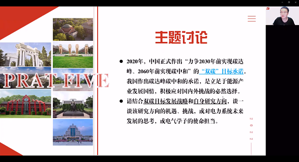 随后,活动迈向学科发展前沿,展开了以“双碳目标的发展战略和自身研究方向”为主题的讨论,四个支部的同志立足自身研究方向的机遇挑战,进行了广泛而深刻的思想碰撞与科研交流。其中,华科吴佳奇同志、清华李楚一同志和贾书宇同志分别就电网的能源供给侧改革、电网的用户侧建模、以及能源互联网的发展,表达对电力系统未来发展的思考,展现了在电气行业发展趋势下,电气学科高校学子的使命和担当。