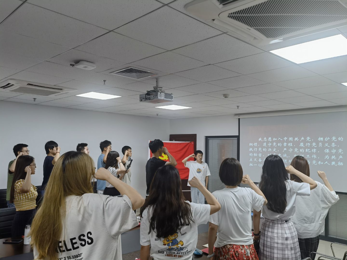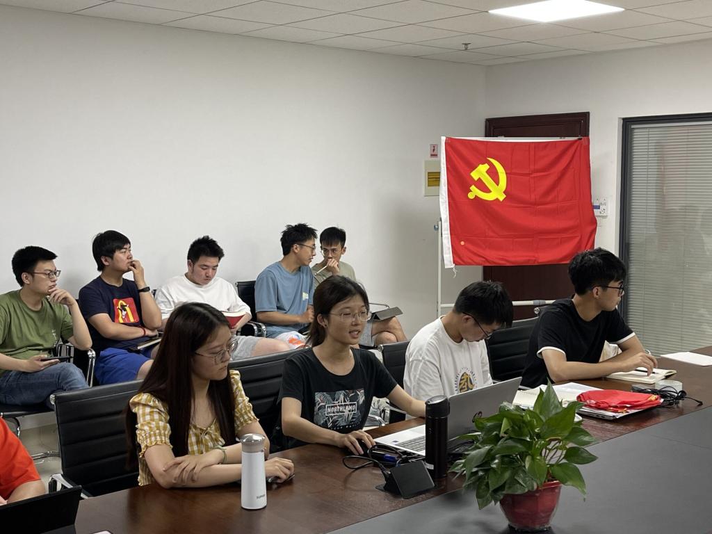 重温入党,为党庆生。恰逢建党节,党支部组织了丰富多彩的活动庆贺党的生日。罗珺老师代表支部向全体成员发放了党徽和制作精美的党员纪念卡,并由郑建栋同志带领全体成员重温入党誓词,以建党101周年为契机,既庆祝党的生日,也庆祝各位支部成员不忘初心使命、牢记责任担当的“政治生日”。同时为了庆祝党的生日,也为了纪念刚刚逝世的著名词作家乔羽先生,在熊馨瑶、董怡然两位同志的领唱下,支部全体成员深情合唱《我的祖国》,在悠扬动听的旋律中念党情、感党恩。在活动的尾声阶段,支部成员在支部旗帜上签字明志,并于党旗合影留念,在镜头前对党诉说心底的祝福。