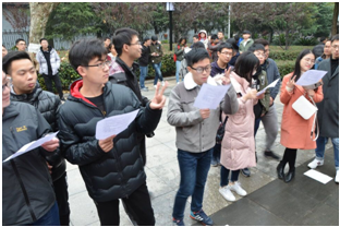 三个班的全体党员同学一齐站在旧址正门前,在硕1704班党支书徐宏伟同志的带领下再次宣誓: “我志愿加入中国共产党,拥护党的纲领,遵守党的章程,履行党员义务,执行党的决定,严守党的纪律,保守党的秘密,对党忠诚,积极工作,为共产主义奋斗终身,随时准备为党和人民牺牲一切,永不叛党。”我们全体党员同志,都应该追随进行者的脚步,勿忘并践行自己曾经宣誓的责任和义务。既然有承诺,则无论在什么情形下,皆应矢志不移,百折不挠地去践诺。重温誓词仅是一种形式,要紧的是以具体、实在、生动的实践,来履行自己当初的诺言,体现于平时的切实努力之中。
