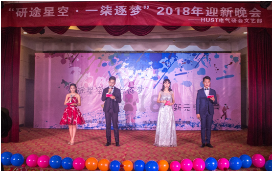 电气与电子工程学院“研途星空•一柒逐梦”研究生迎新晚会与2018年1月14日晚19:00在百景园三楼大厅隆重举行,学院党委副书记罗珺与研究生辅导员雷浩南参加活动。晚会节目精彩纷呈,表演间隙的小游戏更是让观众们热情高涨。