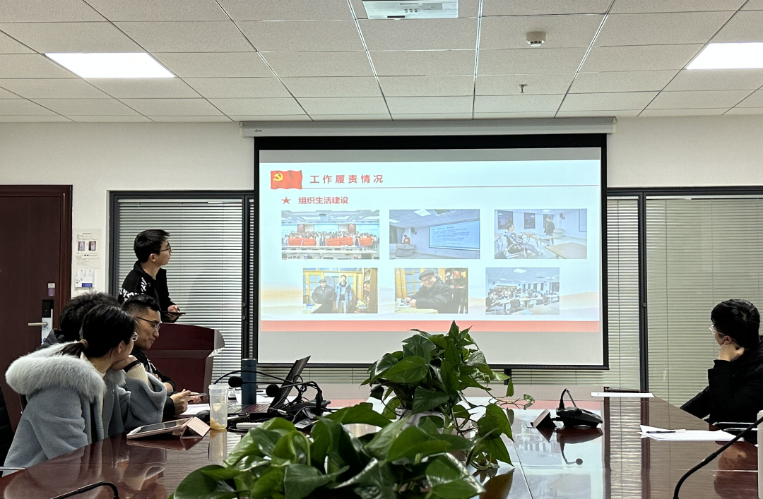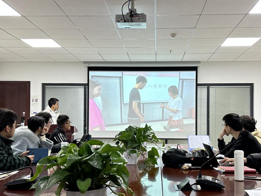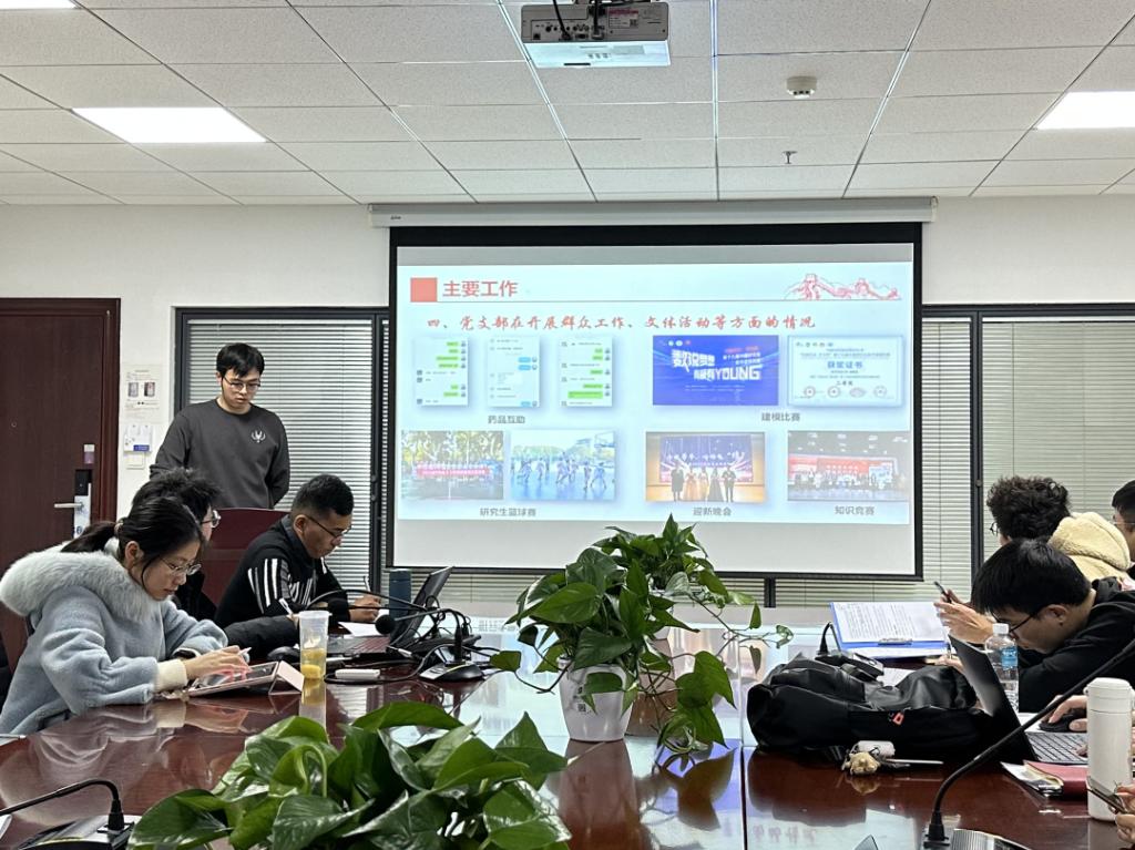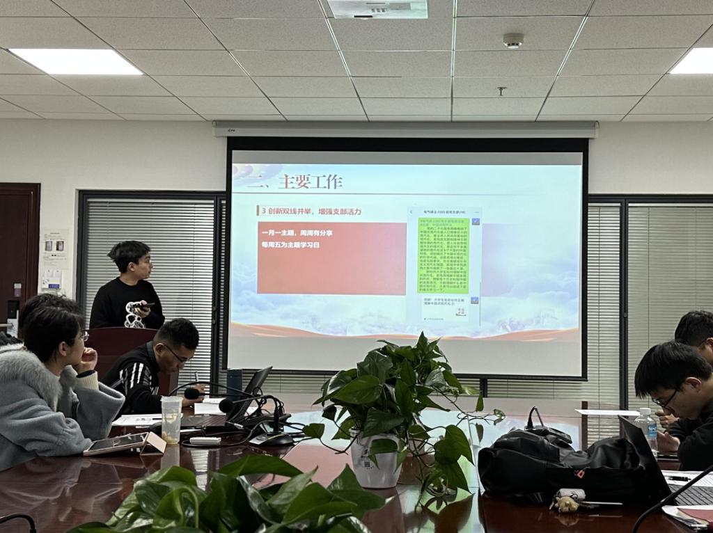 硕2202班党支部书记夏子龙介绍党支部以深入学习党的二十大精神为主线,组织开展了一系列党建相关活动,顺利完成了从建立到发展、从生疏到磨合、从不会学到带头学的全过程。党支部坚持政治引领、夯实理论基础,按时按量组织三会一课工作,定期召开党员大会、支委会、党小组会;党支部把稳意识形态,理论武装思想,支部成员紧密联系工作实际,扎实开展批评与自我批评,深入剖析思想上、作风上存在的突出问题。