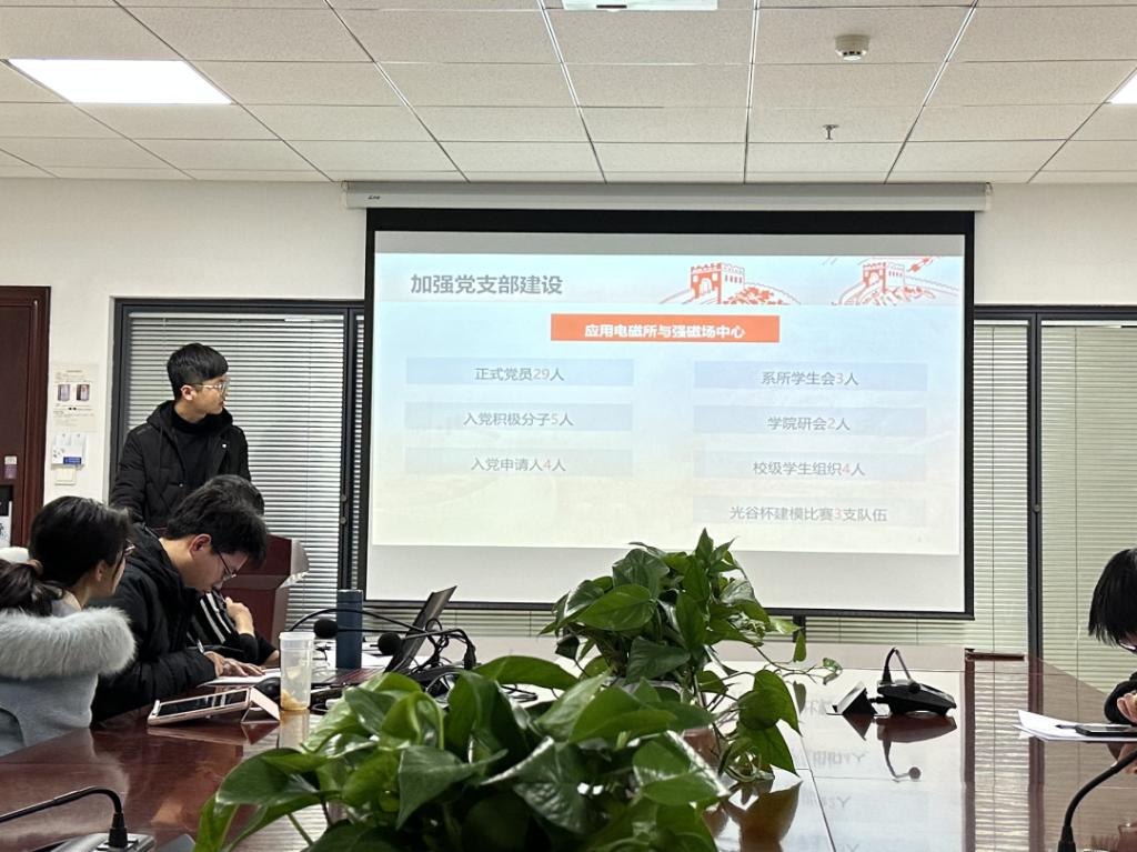 硕2101班党支部书记郑建栋介绍了党支部紧紧围绕学院党委整体部署,在院党委的正确领导下,全面贯彻落实党的二十大和党的二十届一中全会精神,始终以“党旗所指,青春所向”为支部建设思路,紧紧围绕党建带团建、党建促科研的支部建设目标,认真开展各项工作,严格履行党支部“三党员四群众”的主要职责,扎实筑牢党支部战斗堡垒。党支部搭建本科生一对一帮扶平台,鼓励支部党员积极投身学生组织,主动响应校庆、院庆志愿服务,积极开展社会实践活动,在实践中践行入党誓词,积极发挥党员先锋模范作用。