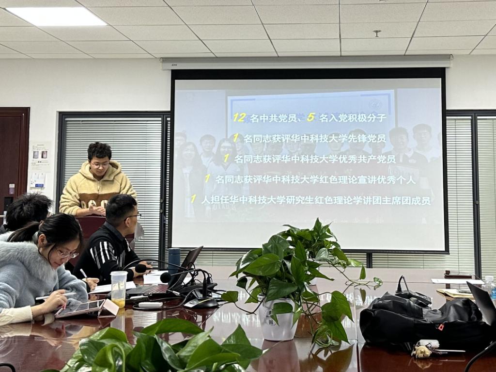 硕2205班党支部书记陈俊从创造集体感、强调责任感、打造家文化等方面介绍了党支部的工作。在党支部建立初期,以举办体育活动等方式促进支部成员之间的交流,将党支部凝聚成一个有力的集体;党支部多次与兄弟院系共同开展主题党日,并聚焦于情感教育和人文关怀,与华中科技大学研究生支教团广西百色分队进行访谈交流活动,与贵州务川分队进行捐款活动,温暖自己的同时照亮他人。