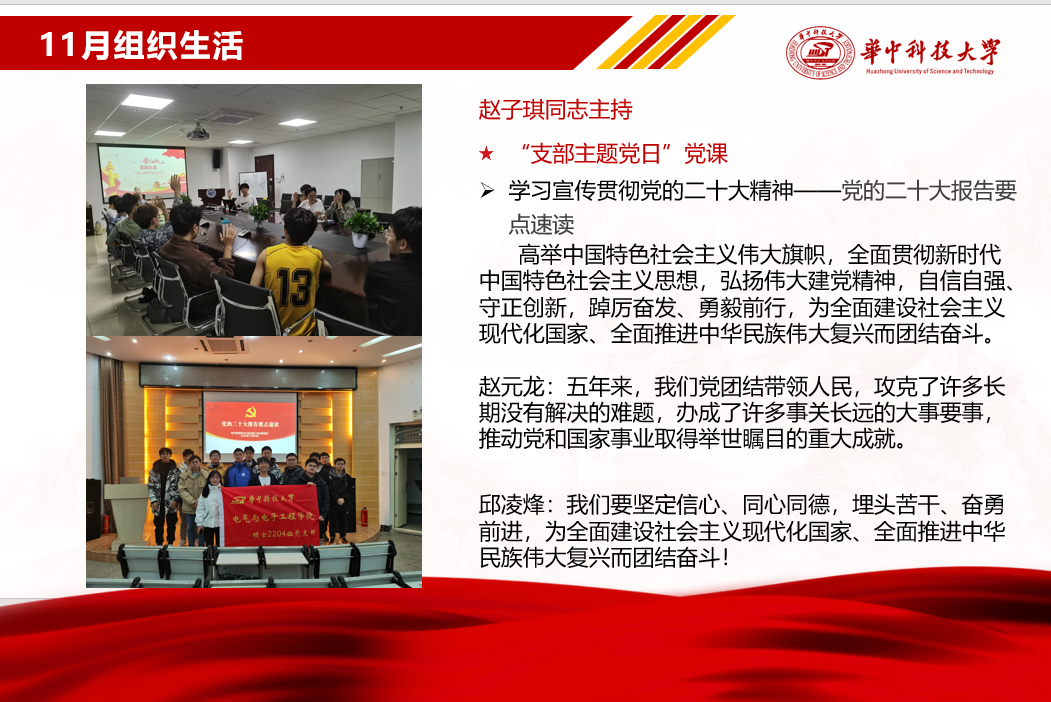硕2209班党支部书记韩瑞瑞表示在上学期党建工作中,党支部坚持政治引领,筑牢思想根基,开展主题为科教兴国、人才强国、重温红色记忆实践活动、通读习近平治国理政等多次主题党日活动;在二十大胜利召开和七十年校庆迎来之际,党支部开展了重温红色记忆,追寻红色足迹的爱党爱国实践活动;党支部回顾历史,云走访“八七会议旧址”以及“武昌起义纪念馆”,重温会议内容以及武昌起义背景过程,更加坚定了历史自信,赓续红色血脉。