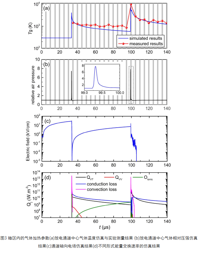 论文同时建立了考虑质量守恒、动量守恒、平动动能和振动动能守恒的先导放电气体加热动力学过程1维径向数值仿真模型,以实测放电电流作为输入,仿真获得了暗区时间内放电通道中心气体温度变化曲线。与实测结果对比表明(如图3a所示):在暗区起始初期,由于V-T转化不能补偿通道气体的热对流和热扩散作用,气体中心温度呈现下降趋势,实测和仿真结果吻合较好;而经典的Gallimberti模型未考虑放电通道气体热传导和热对流导致的能量损失,夸大了V-T转化对气体加热的贡献。在暗区时间的后半段,由于通道内部电场开始恢复,离子电流的加热作用增强,可以部分补偿热对流和热传导作用,使得气体温度最终稳定在1000K,同时离子电流加热导致了细加热通道precursor的形成。论文最后还讨论了后续研究precursor通道特性所需要在实验测量系统和数值仿真模型两个方面的改进方向。本文的研究工作可为丰富长空间隙放电先导的形成物理过程的认识提供参考。
