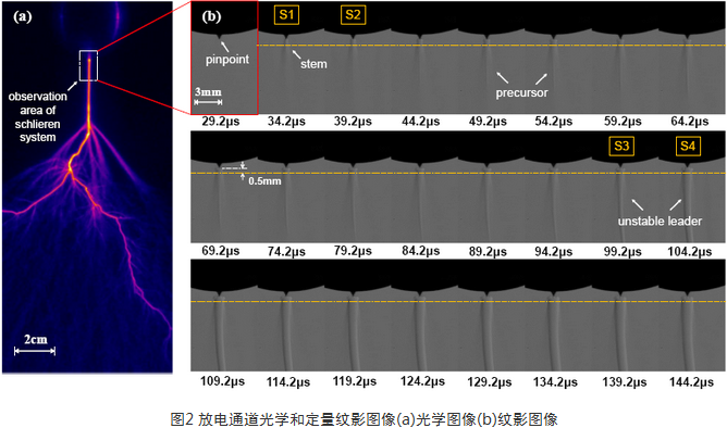 本文首先构建了适用于m级长间隙放电观测的定量纹影测量系统(如图1所示),其时间分辨率为1.25μs/frame、空间分辨率为48.5μm/pixel,获得了流注向先导放电转化过程中连续时域分辨的纹影图像(如图2b所示)。通过优化设计放电电极结构,实现了电极附近先导放电通道数量和路径的调控(如图2a所示),解决了因长间隙先导放电路径随机性而导致Abel反变换圆柱对称假设难以满足、温度反演误差大的问题。实验发现了暗区时间内流注茎前方细加热通道形成和发展现象(precursor)。测量获得了首次暗期和二次暗期内,先导通道径向气体密度分布和温度分布及其随时间的连续变化规律。测量结果表明,当流注放电停止后,先导通道中心温度在暗期时间内呈现逐渐下降趋势,最后稳定于1000K左右。