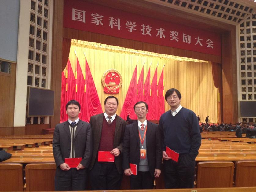 获奖团队部分成员在人民大会堂颁奖现场(左三是尹项根教授)