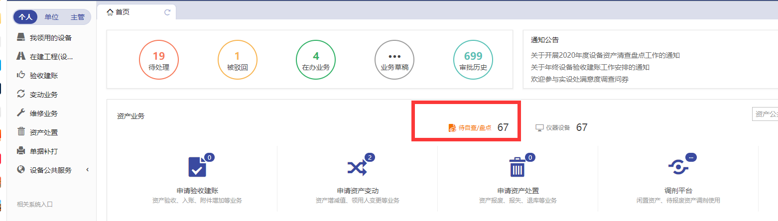 特别提醒:设备和家具管理系统,在资产管理员线上提交至主管部门资产清查审核期间,请勿进行更改领用人的操作(此时操作无效)。
