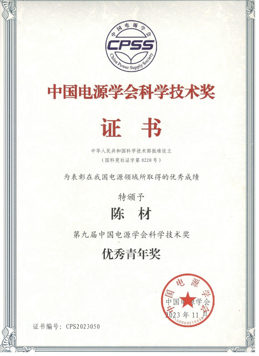 陈材是国家高层次青年人才,2022年入选湖北省“楚天学者”计划;荣获2021年日内瓦国际发明展银奖(排1,《应用于未来绿色能源的高功率密度电能变换技术》);指导学生研发的基于宽禁带半导体的高功率密度电源获高校电力电子应用设计大赛奖项4次(特等奖2次,一等奖2次)、华为大学生电力电子竞赛最高奖一等奖2次。