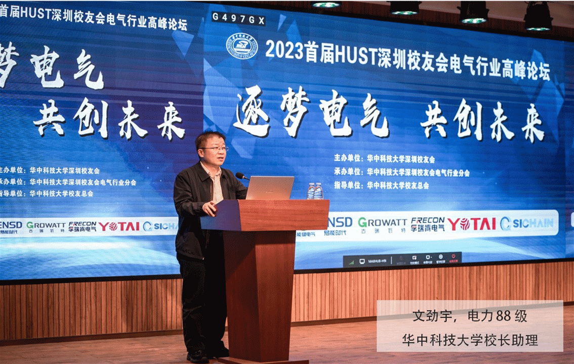 论坛邀请了华中科技大学校长助理文劲宇(电力88级),校友工作及对外联络办公室主任黄坤华,华中科技大学深圳校友会会长、深圳市神州通投资集团有限公司总裁喻子达(动力81级),华中科技大学深圳校友会电气行业分会名誉会长、深圳永泰数能科技有限公司董事长盛剑明(电力91级),国家能源局南方监管局二级巡视员 (退休)梁定敏(电力79级),上海电气分会会长、上海思源电气副总裁陈邦栋(高压87级),武汉校友会副会长、武汉豪迈电力创始人/董事长陈前臣(电力81级)代表致辞。