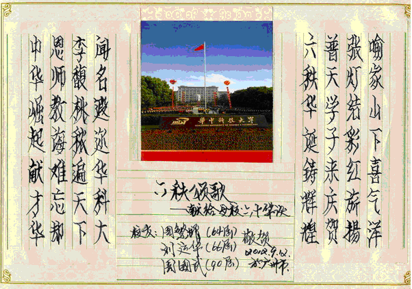 2012年9月12日,伟德(bevictor)官方网站64届校友周繁增、66届校友刘运华和90届校友周国武共同作诗献给母校六十华诞: