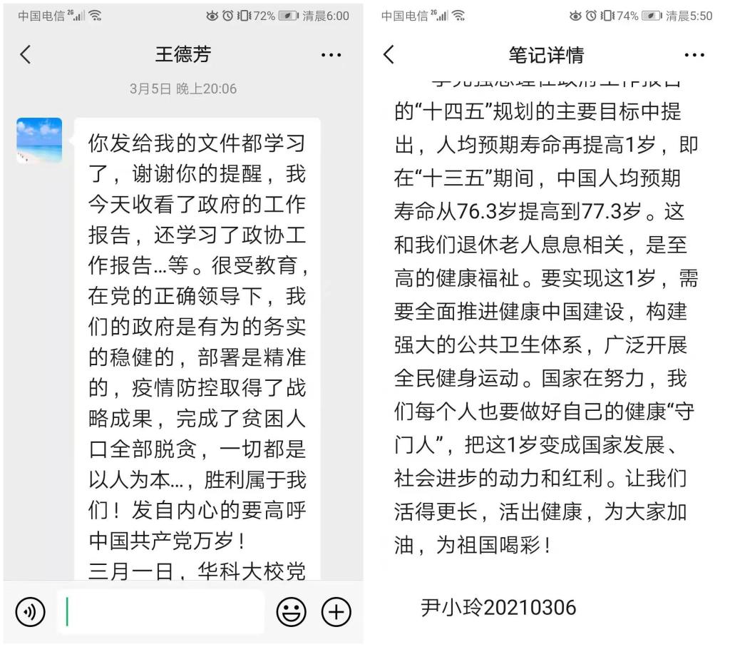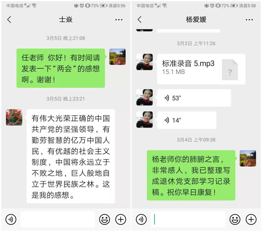杨爱媛老师在群里发了讲话录音“作为武汉人经历了2020年的艰难抗疫,往事回忆,感慨万千,最感动我的有三个感想,第一个感想是:没有中国共产党就没有今天抗疫的胜利,是党中央的坚强领导,习近平主席的亲自指挥,全国人民支援武汉,众志成城、同舟共济我们战胜了疫情,制度的优越性在全世界有目共睹。第二个感想是:中国共产党全心全意为人民服务,一切为了人民的利益,疫情后经济快速恢复,人民生活水平不断提高,这是我们每个人都能亲身感受到的。第三个感想是:展望2021年我们国家会更快的发展,中国取得脱贫攻坚的伟大胜利真是不容易。我今年84岁了作为一个老党员我高兴自己晚年赶上了好的年华,我要活到老学到老,学习“两会”精神,学习好党的新理论,新思想,不断提高自己,不断进步,与党永远“同心同德”。