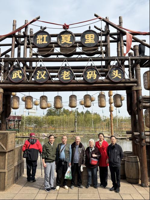 下午,退休教师们继续在江夏里街区游玩打卡。木质栈道挂满竹编灯笼,如古朴风铃漾古韵。远处建筑飞檐翘角,尽现老武汉码头风格。走过流水小桥,穿行于错落有序的店铺,时而拾阶而上,时而顺坡而下,上上下下,七拐八拐,看似无路又见路,迷宫趣味恒生。江夏里的设计建造用尽了巧思,以文化传承为基础结合武汉码头文化的精髓,通过复原老码头建筑风貌、重现市井生活场景,让游客在漫步街区时能真切感受到武汉老码头独特的历史文脉。老师们互相帮忙拍照,有的站在“江夏里”复古牌坊下合影,有的以码头主题壁画为背景定格笑容,还不忘拉上同行的老同事、老搭档,记录下这份难得的相聚时光。